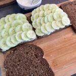 4. Pat dry the cucumber with kitchen towel. Layer the sandwiches with the sliced cucumbers. Then top with the remaining sandwich bread.