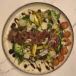Steak Salad with Blue Cheese, Broccoli, Onion, Mix Veggies.